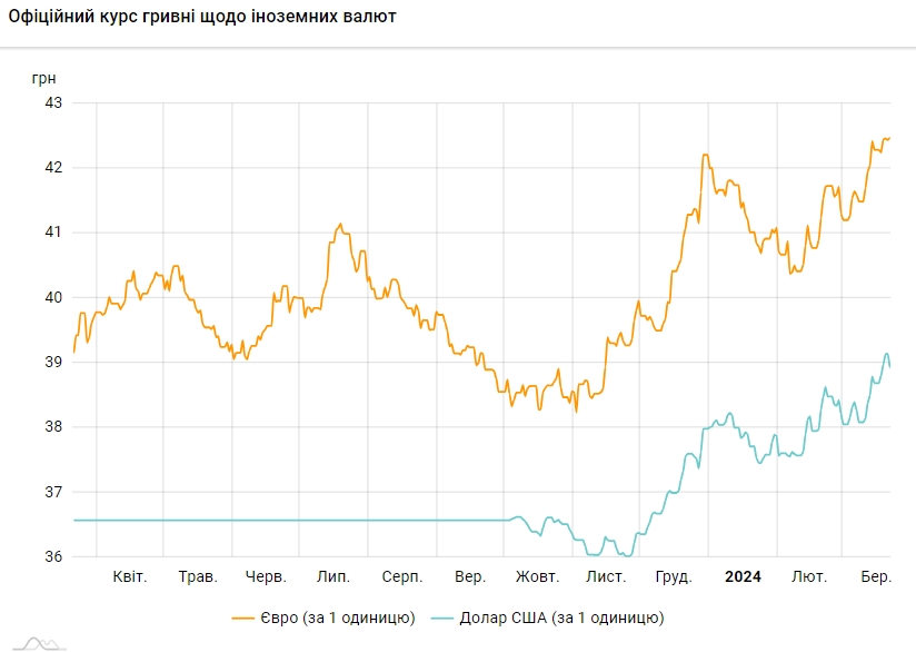 Офіційний курс на 22 березня 2024 року встановлено на такому рівні: 38,9234 грн за 1 долар (-0,2165 грн).