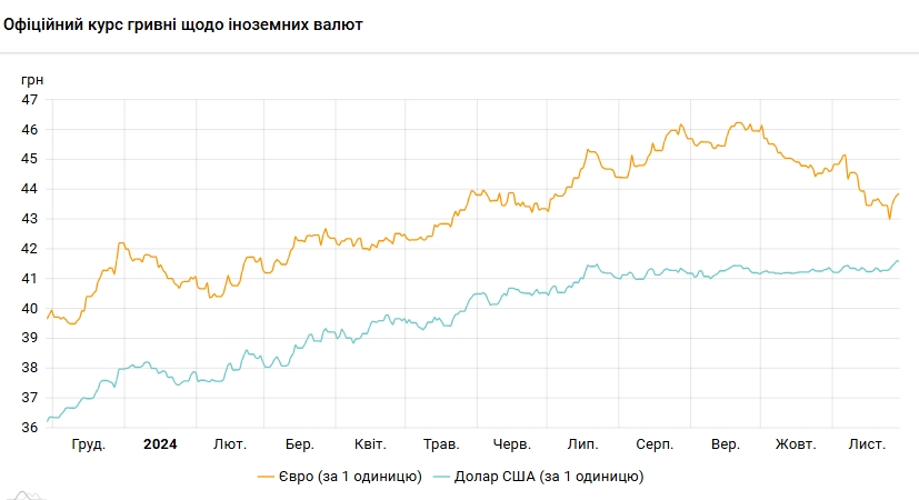 Офіційний курс на 29 листопада 2024 року встановлено на такому рівні: 41,5956 грн за 1 долар (-0,0054 грн).