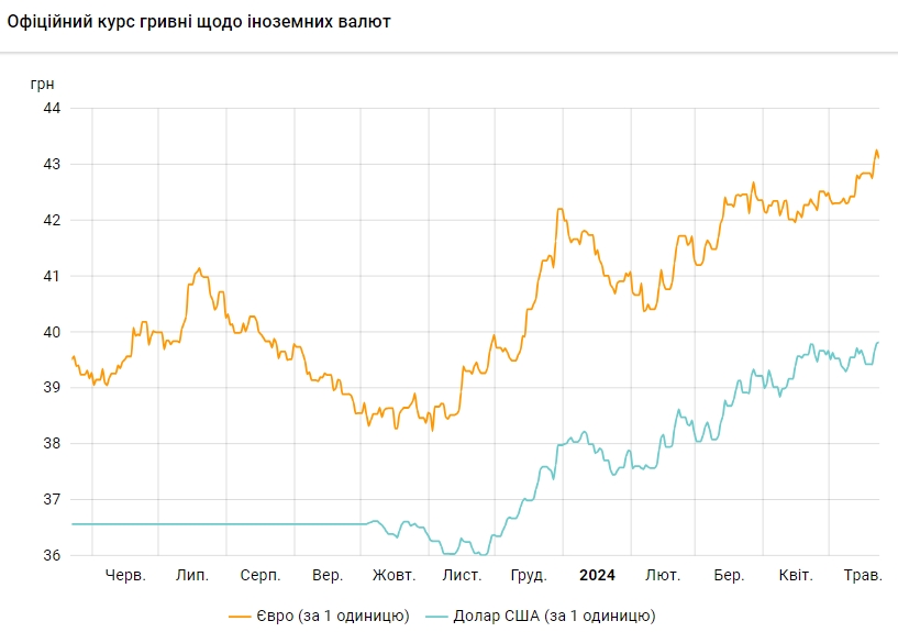 Офіційний курс на 23 травня 2024 року встановлено на такому рівні: 39,8250 грн за 1 долар (+0,0198 грн). Попередній максимум було зафіксовано день тому, 22 травня - 39,8052.