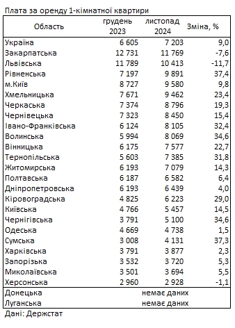 За 2023 рік середня плата за місячну оренду 1-кімнатної квартири в Україні зросла на 15,9% до 6 605 гривень. На перше місце вийшла Закарпатська область, де оренда зросла на 46,2%. На початку 2024 року на перше місце знову вийшла Львівська область, однак потім знову опустилася на друге місце.