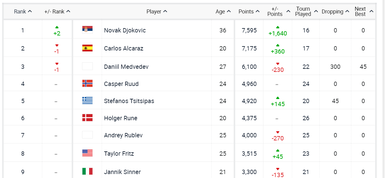 Джоковіч випередив Карлоса Алькараса, який опустився на другу сходинку. Іспанець набрав 7175 пунктів. Він поступився новому лідеру класифікації у півфіналі French Open. Нейтральний росіянин Даніїл Медвєдєв опинився на третій сходинці (6100 очок).