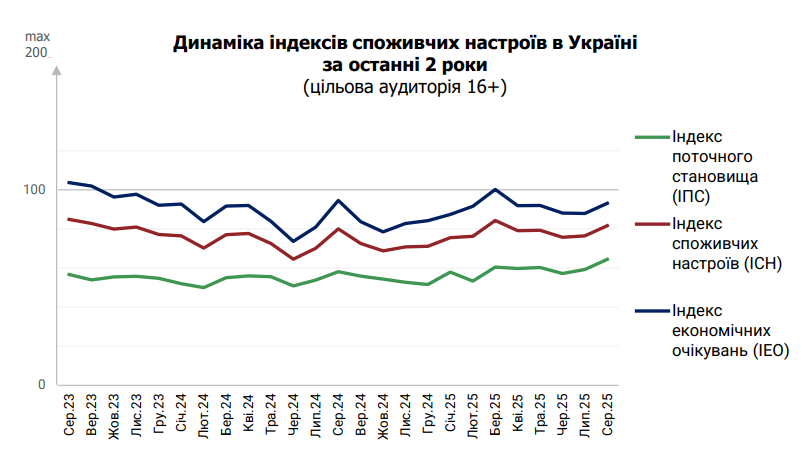 Як зазначають аналітики Info Sapiens, після кількох місяців незначного падіння, індекс споживчих настроїв показав зростання в серпні 2025 року. Аналогічна тенденція спостерігається щодо індексу поточного становища та економічних очікувань.