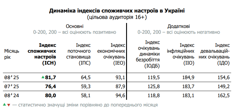 У серпні 2025 року Індекс споживчих настроїв українців зріс на 5,2 пункти та становить 81,7 п. Зросли усі складові індикатора.