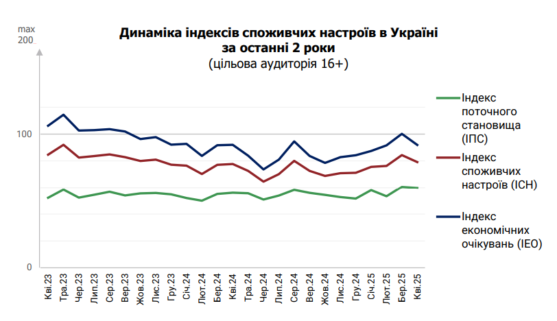 "Індекс споживчих настроїв показує значимо негативну динаміку у квітні 2025 року. Ключовий драйвер зниження - негативні економічні очікування. Населення України більш негативно оцінює розвиток економіки країни, як впродовж року, так і впродовж 5-ти років (у порівнянні з попереднім періодом). При цьому, поточне становище населення України без значущих змін", - коментують аналітики Info Sapiens.