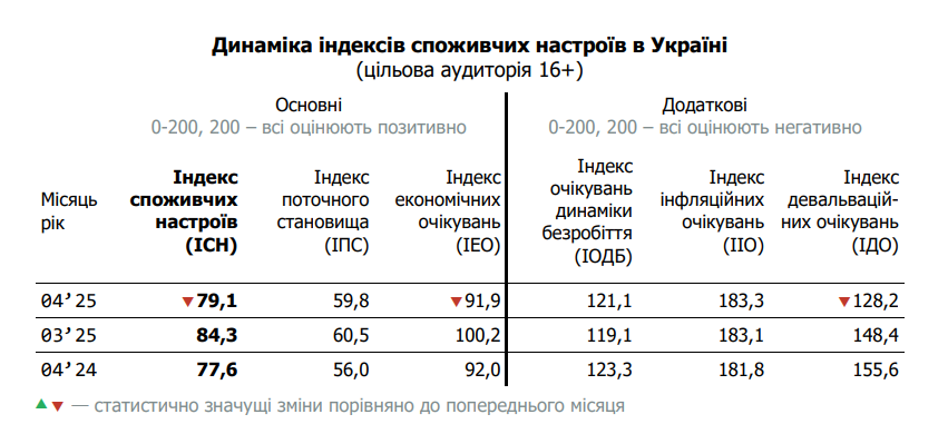 Індекс споживчих настроїв українців у квітні 2025 року зменшився на 5,2 пункти та становить 79,1 п. Водночас значно покращилися валютні очікування.