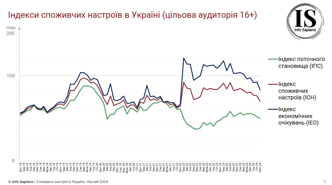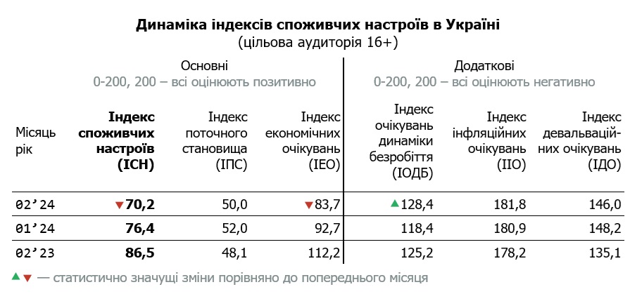 Індекс споживчих настроїв українців у лютому 2024 року зменшився на 6,2 пункти та становить 70,2 п. Зменшилися усі складові індикатора, крім Індексу поточного особистого матеріального становища.