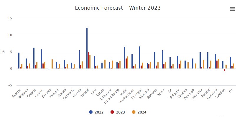 Прогноз зростання ВВП на 2023 рік підвищено з 0,3% до 0,8% у 27 країнах ЄС та до 0,9% у 20 країнах зони євро. Прогноз темпи зростання на 2024 рік залишається незмінним - 1,6% та 1,5% для ЄС та зони євро відповідно.