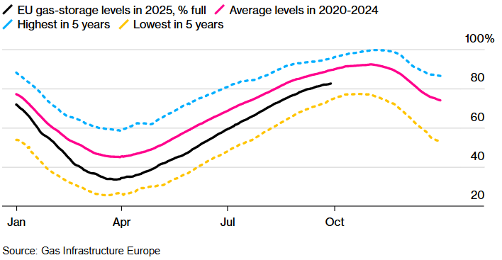 Останніми тижнями темпи поповнення сповільнилися через ремонтні роботи в Норвегії та Алжирі, а також раннє похолодання. Проте запаси можуть досягти 89% до кінця жовтня.