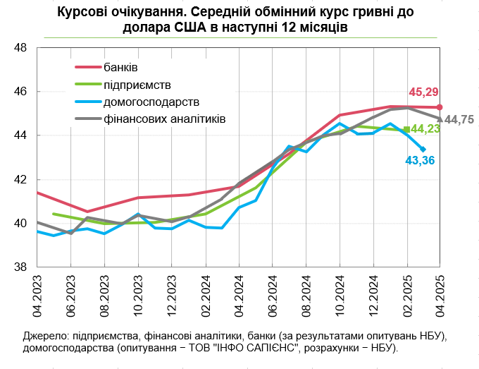 За інформацією НБУ, фінансові аналітики у квітні 2025 року поліпшили прогноз щодо курсу долара протягом наступних 12 місяців до 44,75 грн/долар. Поліпшення очікувань зафіксовано вперше з грудня 2023 року.