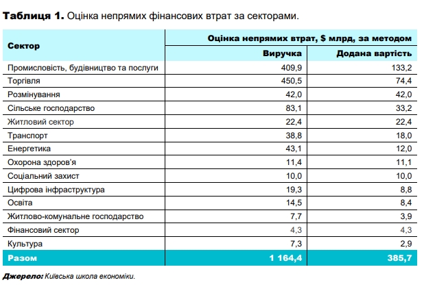 З початку повномасштабного вторгнення Росії загальна сума непрямих втрат, які були та будуть завдані Україні, оцінюються в 1,164 трлн доларів (виручка). Втрати доданої вартості становлять 385 млрд доларів і перевищують ВВП України в 2021 році майже вдвічі.