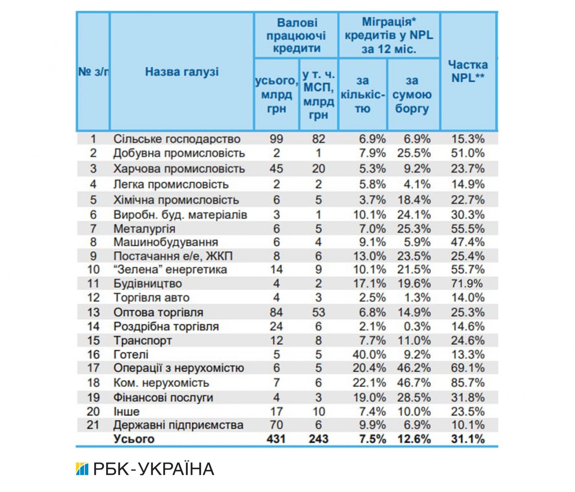 Станом на 1 грудня 2023 року рівень NPL (кредити юридичним та фізичним особам) становили 39,7% загального портфеля банківських кредитів, у корпоративному сегменті – 44,1%, у роздрібному – 24,9%.