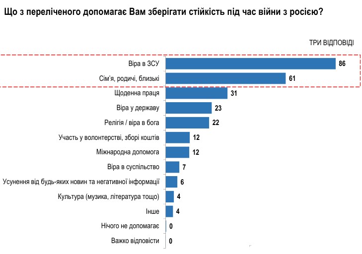 Віра в Збройні сили України (86%) та сім’я і близькі (61%) - основні фактори, що допомагають українцям зберігати стійкість під час війни з Росією.