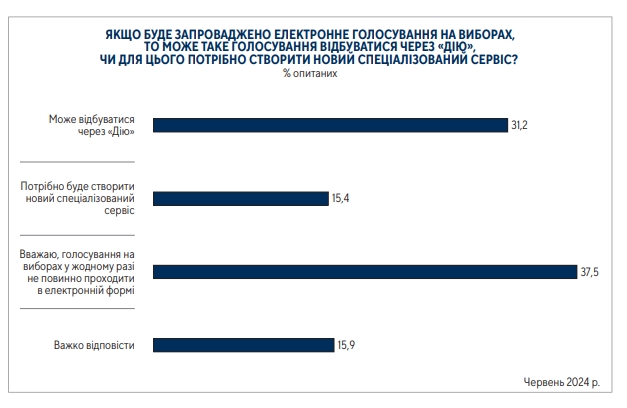 Майже третина (31%) опитаних при запровадженні електронного голосування на виборах вважають, що воно може відбуватися через "Дію", 15% ˗ що потрібно буде створити новий спеціалізований сервіс. Водночас 37,5% відповіли, що голосування на виборах у жодному разі не повинно проходити в електронній формі, інші (16%) вагалися з відповіддю.