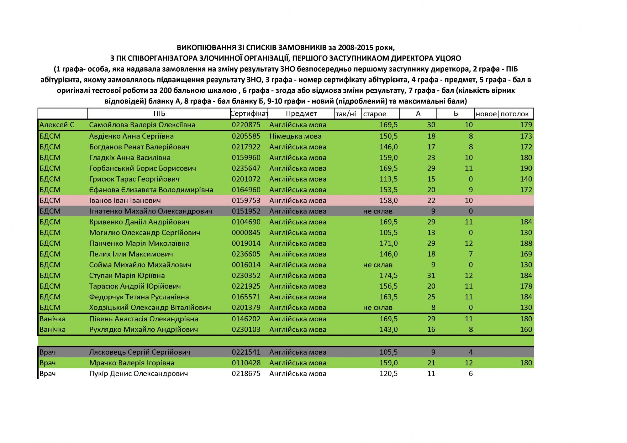 Материалы досудебного расследования по завышению результатов ВНО в 2008-2013 годах выделены в отдельное производство, после завершения которого им будет дана правовая оценка и решен вопрос об ответственности лиц, подавших недостоверные данные о ВНО в 2008-2013 годах (аннулирование выданных им дипломов, возврат ими средств в бюджет, восстановление прав потерпевших).