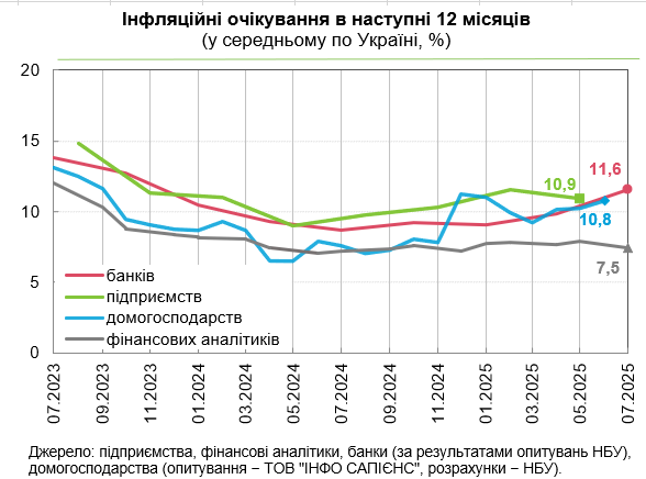 Банкіри в липні погіршили інфляційні очікування до 11,6%. У квітні вони прогнозували зростання цін на рівні 9,8% протягом найближчих 12 місяців.