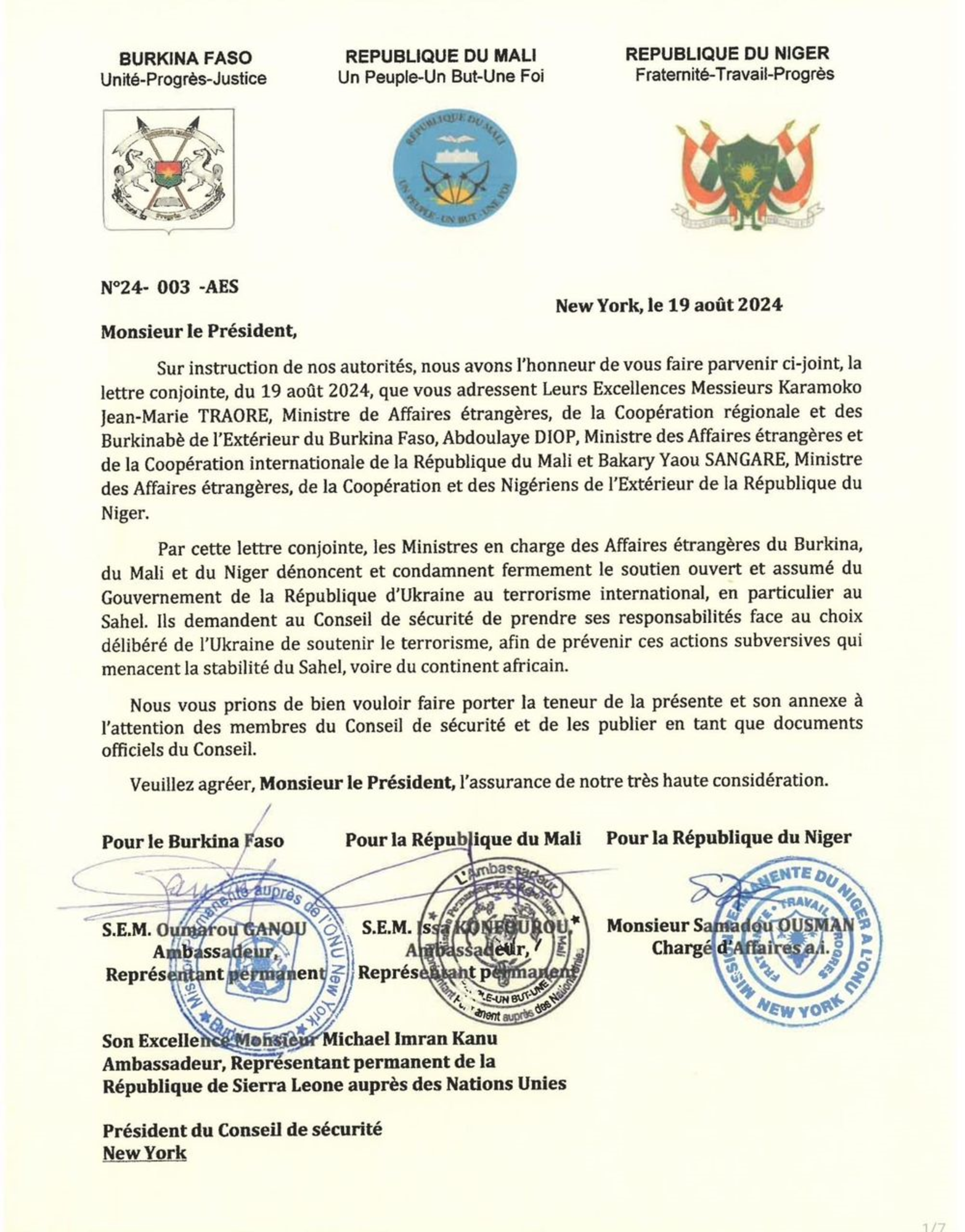 У своєму листі до Ради Безпеки ООН міністри закордонних справ Малі, Нігера та Буркіна-Фасо закликали її "взяти на себе відповідальність" за дії України та запобігти "підривним діям", які загрожують регіональній та континентальній стабільності.