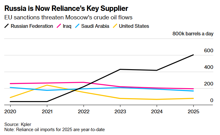 Європа відмовилася від російської нафти, що призвело до зниження цін на її постачання. Індійські компанії активно скуповували дешеву нафту і переробляли її на дизельне паливо, яке потім продавали європейським клієнтам. За даними Kpler, майже половина імпорту нафти Reliance цього року припала на Росію.
