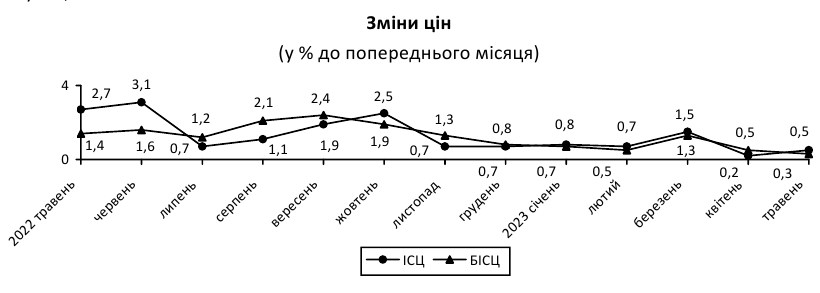 Споживчі ціни в Україні у травні 2023 року, порівняно з травнем минулого року, зросли на 15,3%. Це менше, ніж річна інфляція на місяць раніше (17,9%).