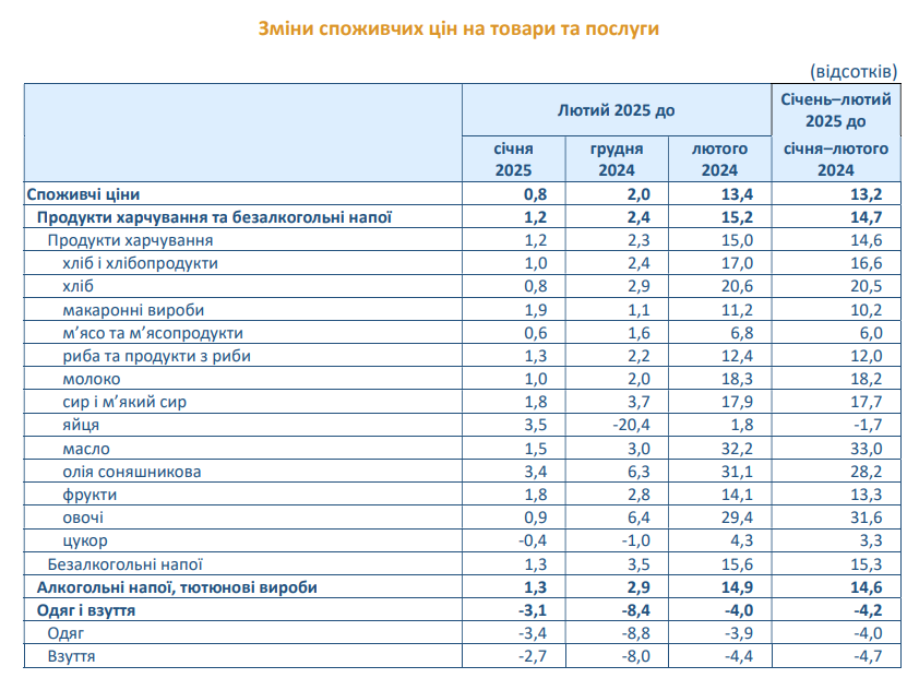 Споживчі ціни в Україні в лютому 2025 року зросли на 0,8%. Річна інфляція прискорилася до 13,4%, порівняно з 12,9% у січні.