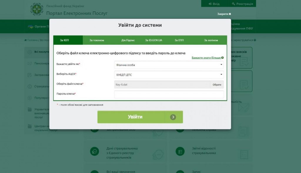1. Заходимо на веб-портал електронних послуг ПФУ, натискаємо кнопку "Вхід".