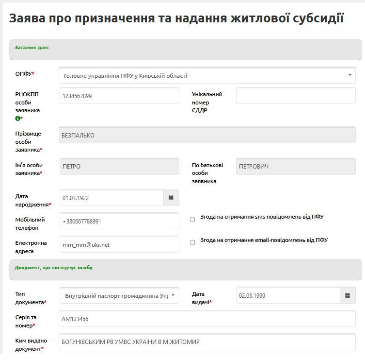 6. Заповнюємо онлайн-форму заяви про призначення та надання житлової субсидії (вказуємо загальну інформацію про особу, яка подає заяву, вносимо її паспортні та адресні дані, вказуємо спосіб виплати субсидії).