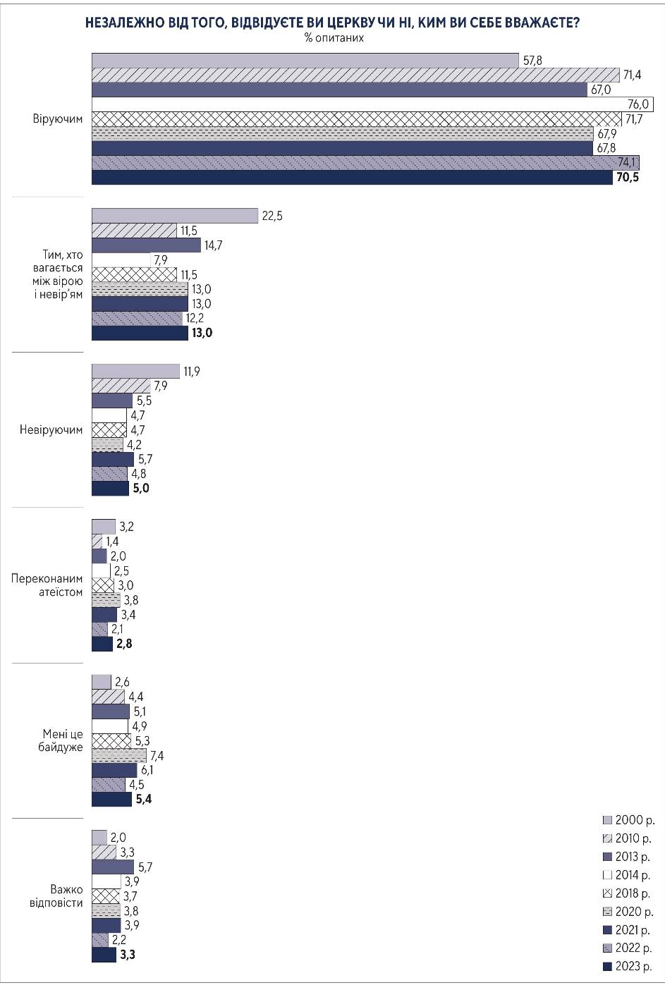 Водночас дослідження 2014 року зафіксувало зростання, порівняно з "довоєнним" 2013 роком, числа віруючих з 67% до 76% - що є характерним для суспільства, що опинилось у стресовій ситуації. Цей показник досі залишається найвищим за всі роки спостережень. Надалі він знижувався і становив наприкінці 2021 року 68% опитаних.