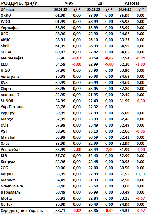 За даними моніторингу, середні роздрібні ціни на 30 вересня 2025 року на бензин А-95 становлять 58,71 гривні за літр (-0,13 гривні за місяць), на дизельне паливо 55,86 гривні за літр (-0,12 гривні), на автогаз 34,31 гривні за літр (-0,12 гривні).