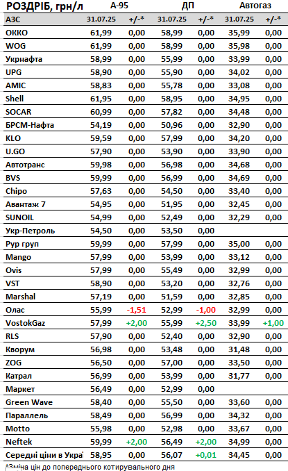 За даними моніторингу, середні роздрібні ціни 31 липня 2025 року на бензин А-95 становлять 58,95 гривні за літр (+0,03 гривні за місяць), на дизельне пальне 56,07 гривні за літр (+0,19 гривні), на автогаз 34,45 гривні за літр (-0,06 гривні).