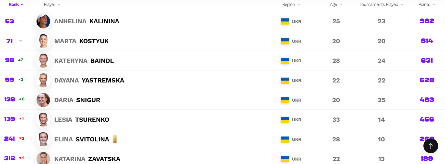 У першій сотні опинилися три співвітчизниці Калініної – Марта Костюк, Катерина Байндль і Даяна Ястремська. До того ж, остання повернулася до топ-100. Невдовзі до них може приєднатися і Дарія Снігур. В активі юної українки 463 очки та прогрес на вісім сходинок угору за тиждень.