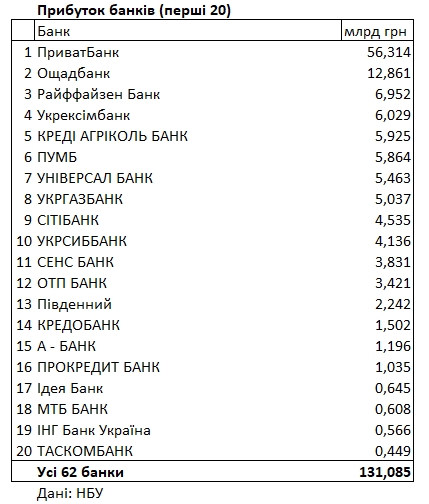 Рейтинг за прибутковістю, як і раніше, очолює державний ПриватБанк, який заробив 56,314 млрд гривень.
