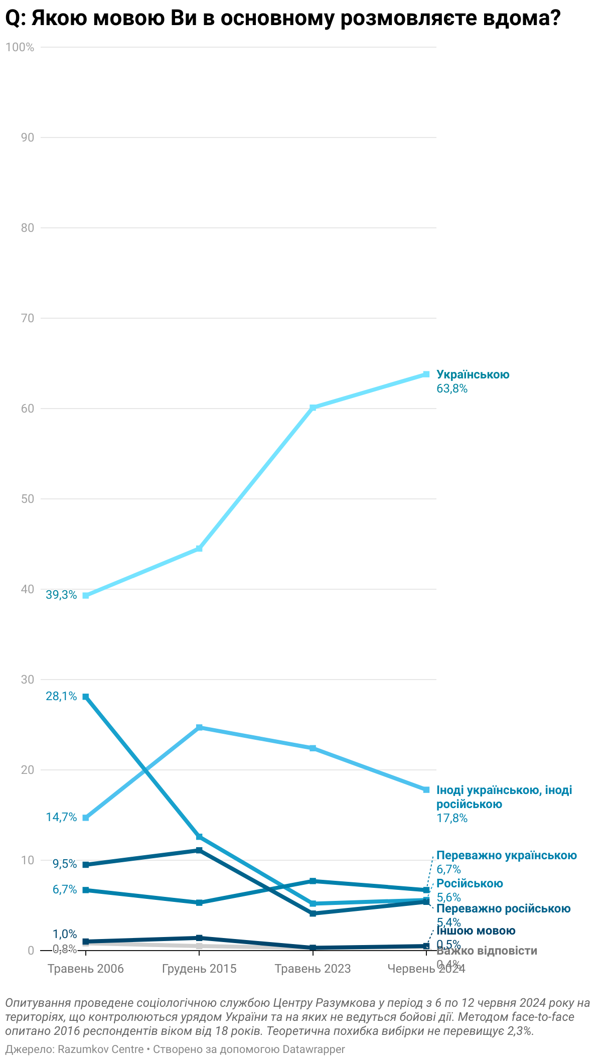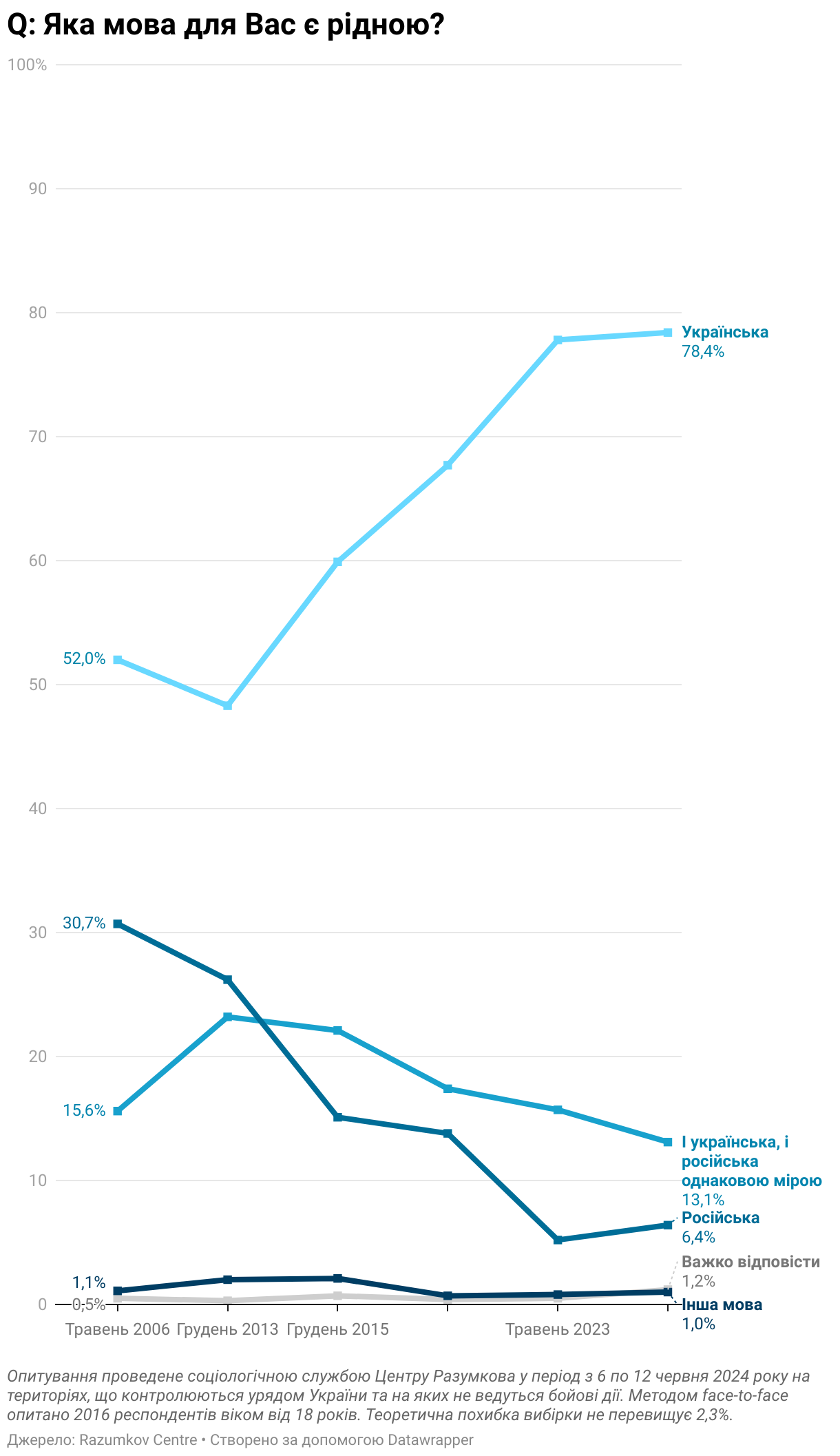 У 2024 році українську мову рідною назвали 78% опитаних. У 2017 році таких було 68%, у 2015 році ˗ 60%, у 2006 році ˗ 52%.