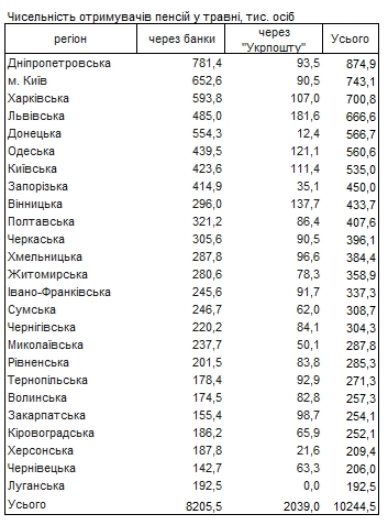 За даними ПФУ, найбільше пенсіонерів було у Дніпропетровській області 781,4 тисяч осіб. Крім того, у Києві 652,6 тисяч пенсіонерів, у Харківській області - 593,8 тисяч осіб.