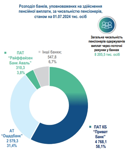 Станом на 1 липня частка ПриватБанку у виплаті пенсій становить 58,1%. У цьому держбанку одержують гроші 4,768 млн осіб. На другому місці державний Ощадбанк (31,4%, пенсії одержують 2,579 млн осіб).