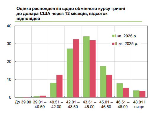 При цьому у I кварталі бізнес очікував на курс 44,23 грн/долар, IV кварталі 2024 року - 44,42 грн/долар, у III кварталі - 43,72 грн/долар, у II кварталі - 41,61 грн/долар.