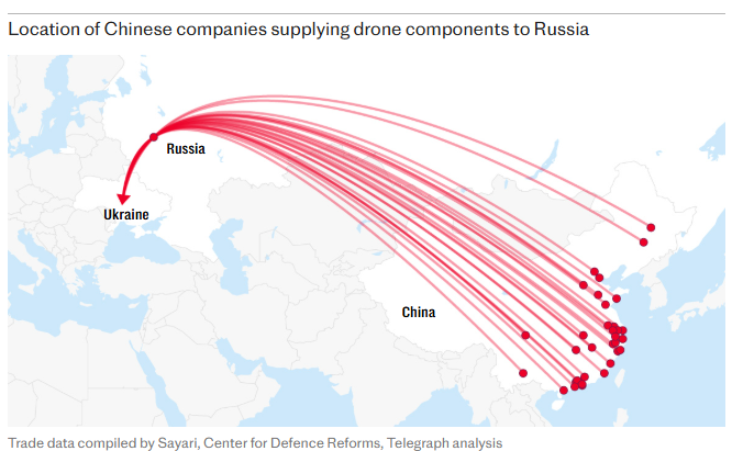 Китай офіційно декларує нейтралітет, але поставки компонентів свідчать про тісну військову співпрацю з Росією. Українські військові знаходять китайські деталі на збитих російських дронах. Один з українських пілотів зазначив: "У нас постійно з'являються плати і чіпи, які явно з Китаю, з китайськими написами."