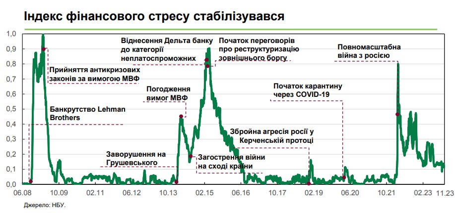 Нагадаємо, Індекс фінансового стресу в Україні різко зріс після російського вторгнення у лютому. Але він був меншим, ніж під час криз 2008 та 2014-2015 років. Наприкінці 2022 року він впав до мінімуму з початку війни.