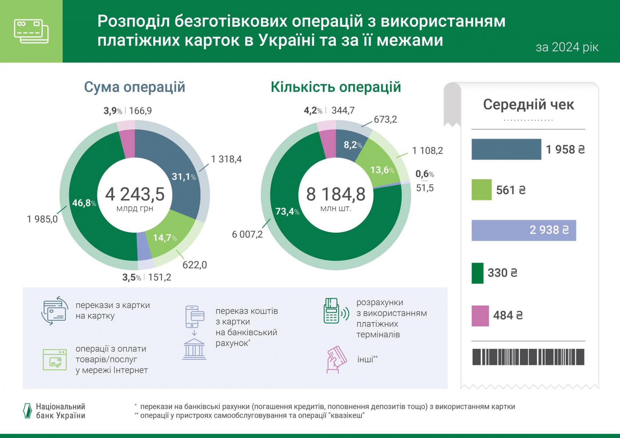 За даними НБУ, сума операцій з використанням платіжних карток, емітованих українськими банками та фінансовими установами, за 2024 рік становила 6 трлн 577,4 млрд грн (з них 90,1% в Україні).