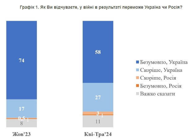 Як зазначають соціологи, 74% до 58% стало менше тих, хто безумовно переконаний у перемозі України. Разом з цим вважають, що переможе Росія, 4% респондентів (у жовтні 2023 року було 2%).