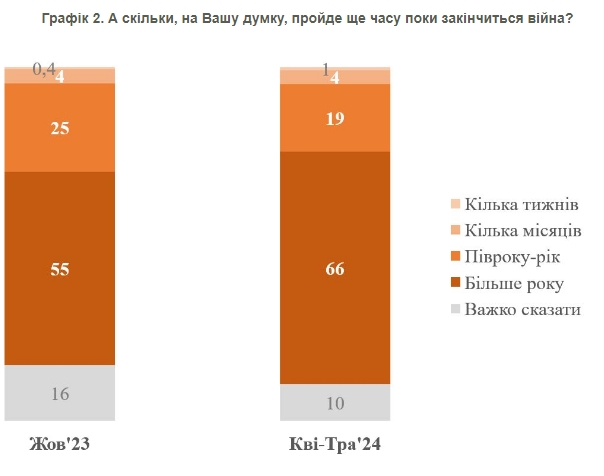 Абсолютна більшість киян очікують, що війна триватиме не менше ніж півроку. З 55% до 66% стало більше тих, хто вважає, що війна триватиме ще більше року.