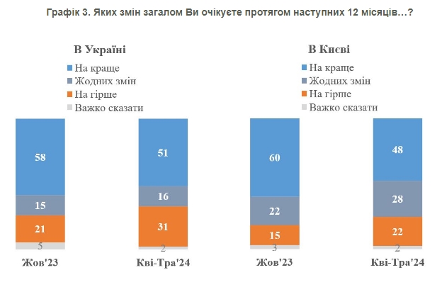 Дещо зростає також песимізм і в оцінках щодо змін у найближчі 12 місяців в Україні та Києві, хоча наразі переважають оптимістичні настрої. Так, 51% вважають, що в Україні в найближчий рік зміни будуть на краще проти 31%, які вважають, що на гірше (у жовтні 2023 року співвідношення було 58% до 21%).