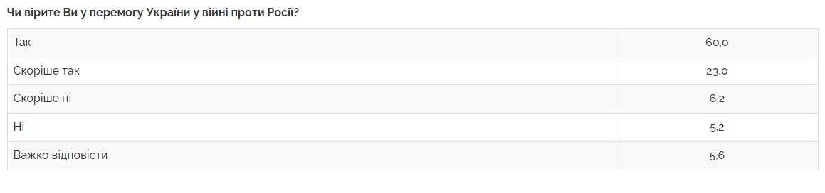 У вересні 2024 року 83% опитаних вірять у перемогу України у війні з Росією, що дещо вище, ніж у червні (80%).