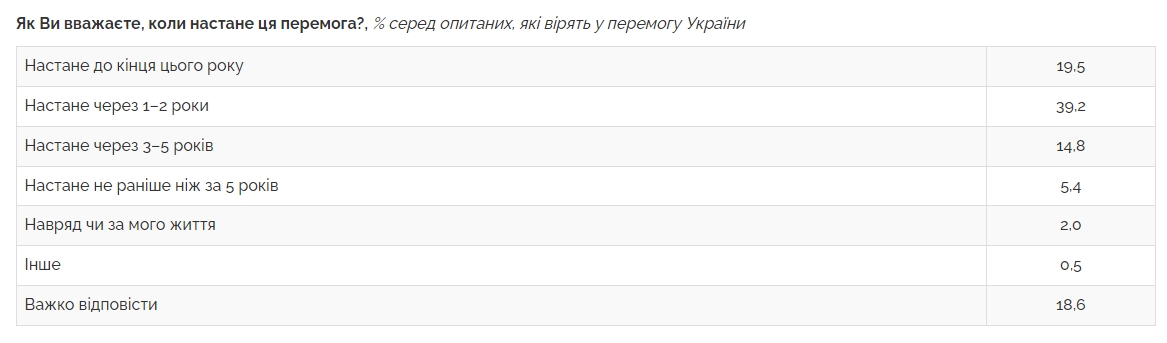 Стосовно термінів настання перемоги, то серед респондентів, які в неї вірять, 39% вважають, що вона настане через 1-2 роки, 19,5% - що вона настане до кінця цього року, 15% - що для цього знадобиться від 3 до 5 років, 5% - більш ніж 5 років, 2% - що перемога відбудеться "навряд чи за мого життя".