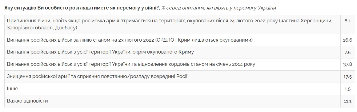 Також 17% вважатимуть перемогою відновлення статус-кво станом на 23 лютого 2022 року, 7,5% - вигнання російських військ з усієї території України, окрім окупованого Криму, а 8% - припинення війни, навіть якщо російська армія залишиться на територіях, які були захоплені внаслідок повномасштабного вторгнення (після 24 лютого 2022 року).