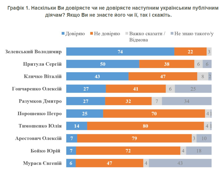 Крім Зеленського єдиний діяч зі списку, який має позитивний баланс довіри-недовіри - телеведучий Сергій Притула. Йому довіряють 50%, не довіряють - 38% (баланс довіри-недовіри - +12%).