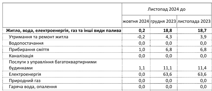 Середні ціни на житло, воду, електроенергію, газ та інші види палива в Україні у листопаді 2024 року, порівняно з листопадом минулого року, зросли на 18,7%. Причиною стало підвищення цін на електроенергію.