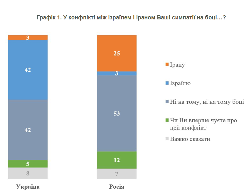 Таким чином, українське суспільство демонструє чітку проізраїльську позицію, на відміну від російського, де Іран має значно більше прихильників.