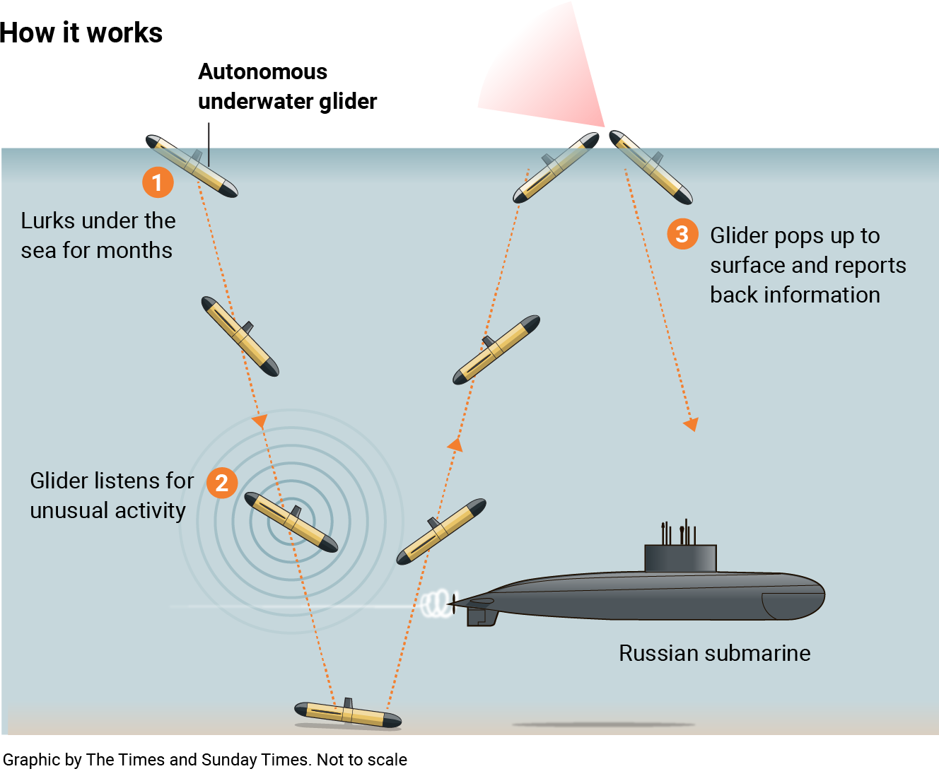 За словами технолога Найла Картрайта, у воду можна запустити сотні таких планерів. Вони просто слухають, а при виявленні дивної активності - наприклад, російського підводного човна - піднімаються і повідомляють дані.