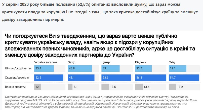 У серпні 2023 року більше половини (52,5%) українців висловили думку, що зараз можна критикувати владу за корупцію.