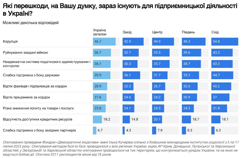 Для порівняння: 37% назвали найбільшою перешкодою руйнування, завдані війною, 36% - неадекватну систему податкового адміністрування і контролю, 36% - слабку підтримку з боку держави. Показово, що проблеми, які напряму залежать від якості державного управління, посідають три з чотирьох перших позицій, які, на думку українців, заважають розвитку підприємництва. Водночас наступними за негативним впливом на підприємництво йдуть відтік фахівців і підприємців за кордон (29%) та відтік працівників за кордон (28%).