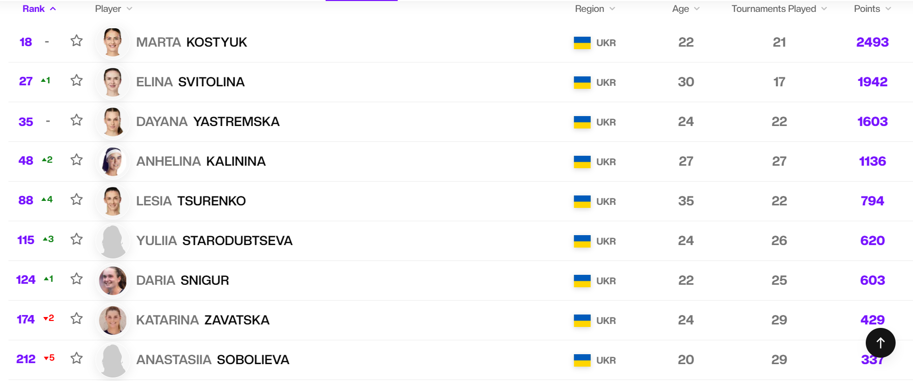 Після Костюк інші українки покращили становище. Навіть Еліна Світоліна, яка достроково завершила сезон і лягла на операційний стіл, піднялася на 27-ме місце. Далі розташувалися Даяна Ястремська (35-та позиція), Ангеліна Калініна (48-ма) та Леся Цуренко (88-ма).